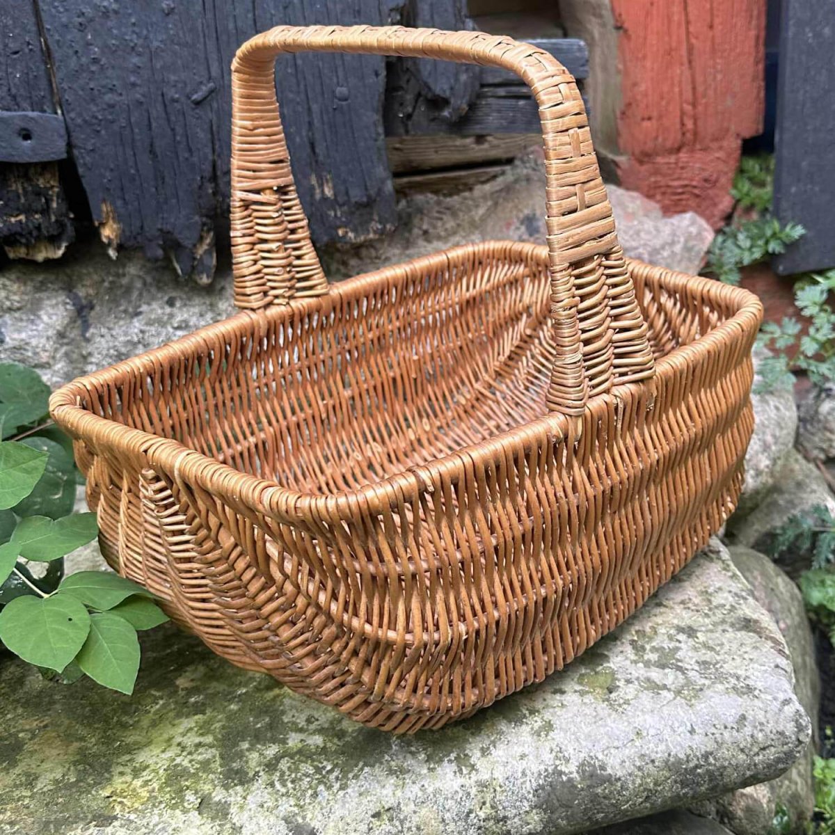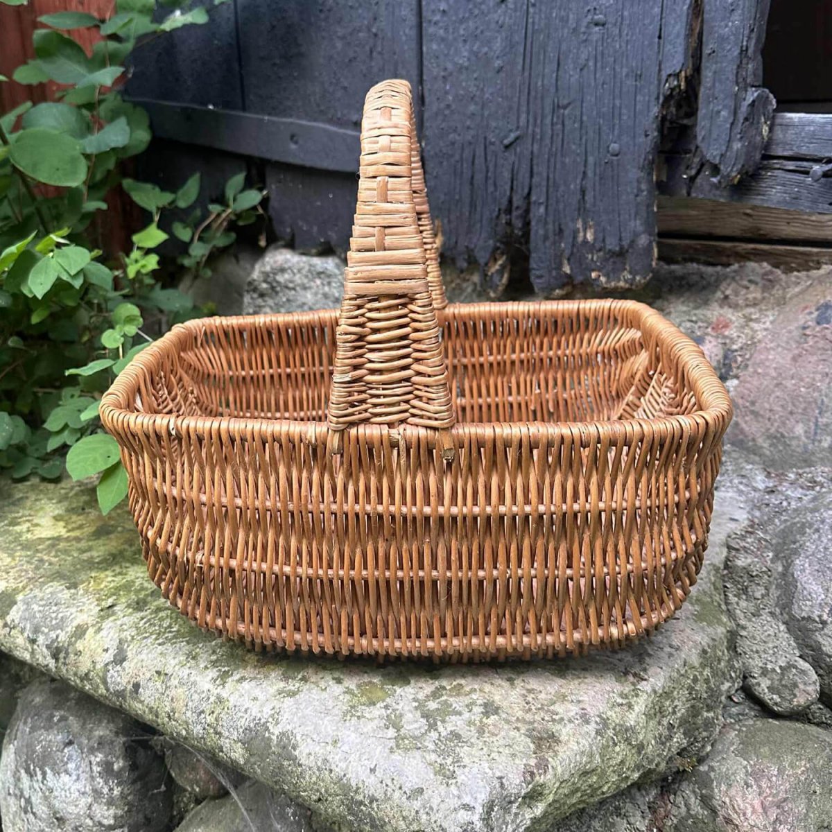 Denne vakre gamle kurven er flettet i naturmateriale og bærer på en lang tradisjon av svensk håndverk. Med sin unike form og patina blir den en sjarmerende detalj i hjemmet – like fin som oppbevaringskurv i gangen som på bordet til frukt eller brød.