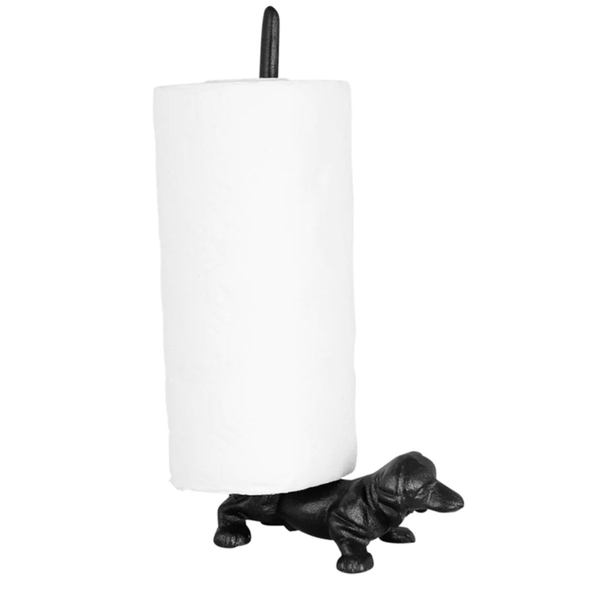 Praktisk og sjarmerende kjøkkenpapirholder i støpejern med motiv av en dachshund. Perfekt for kjøkkenet og en stilfull måte å oppbevare kjøkkenpapir på.