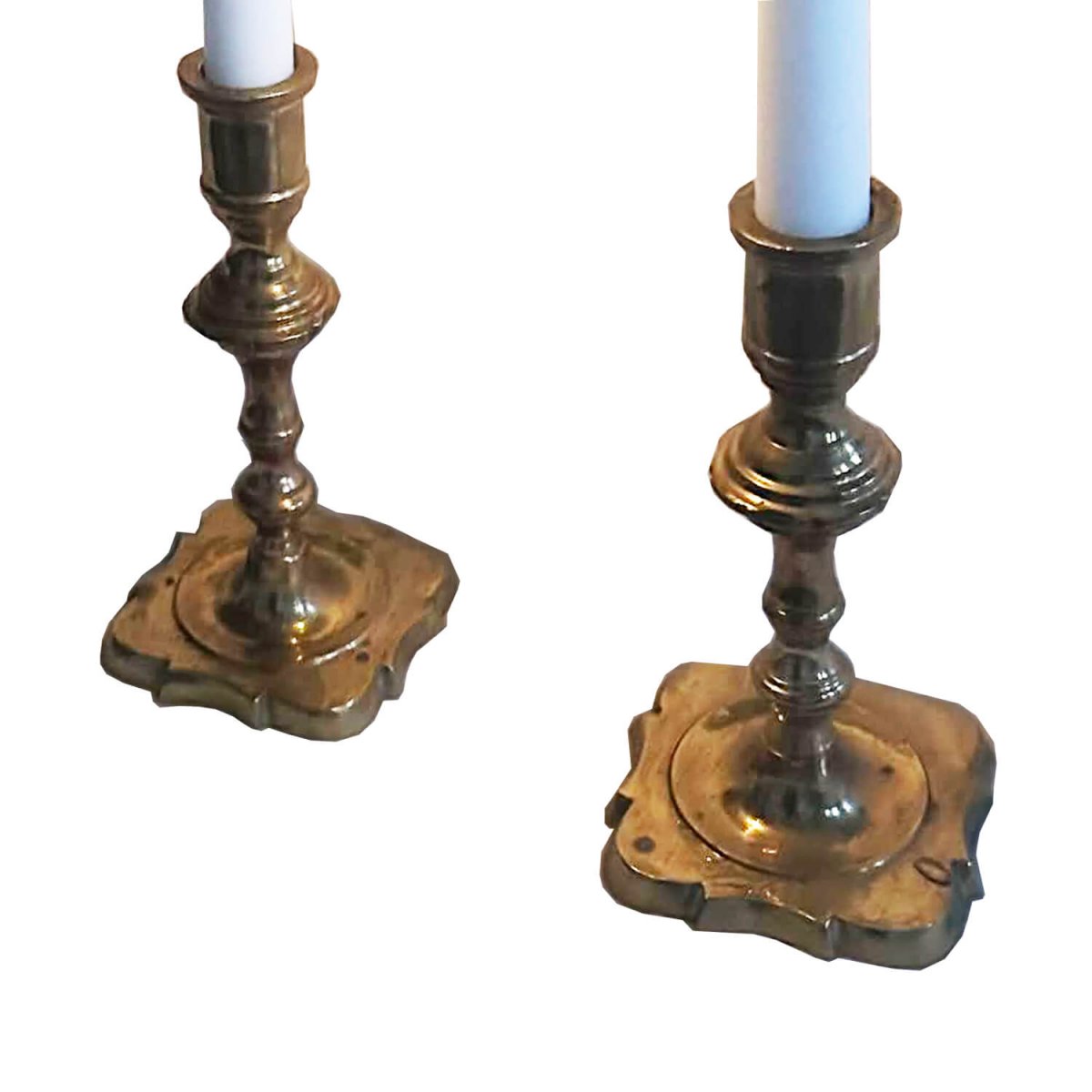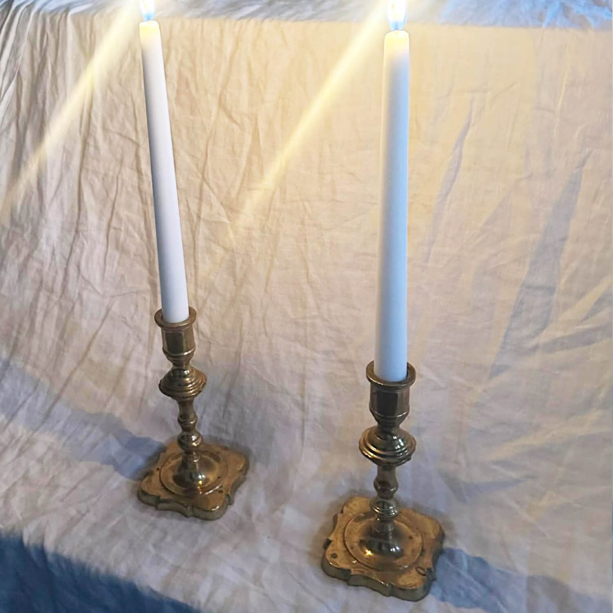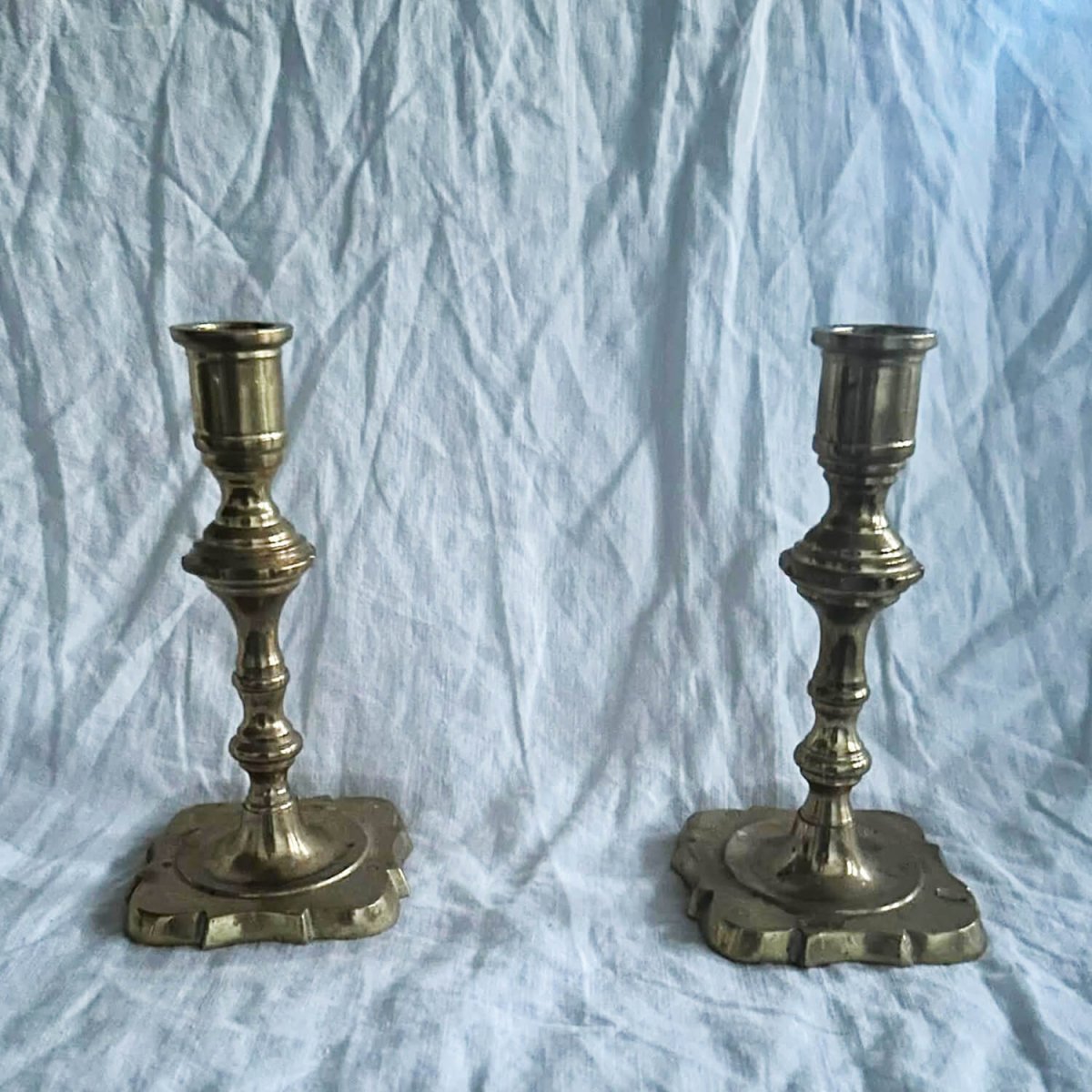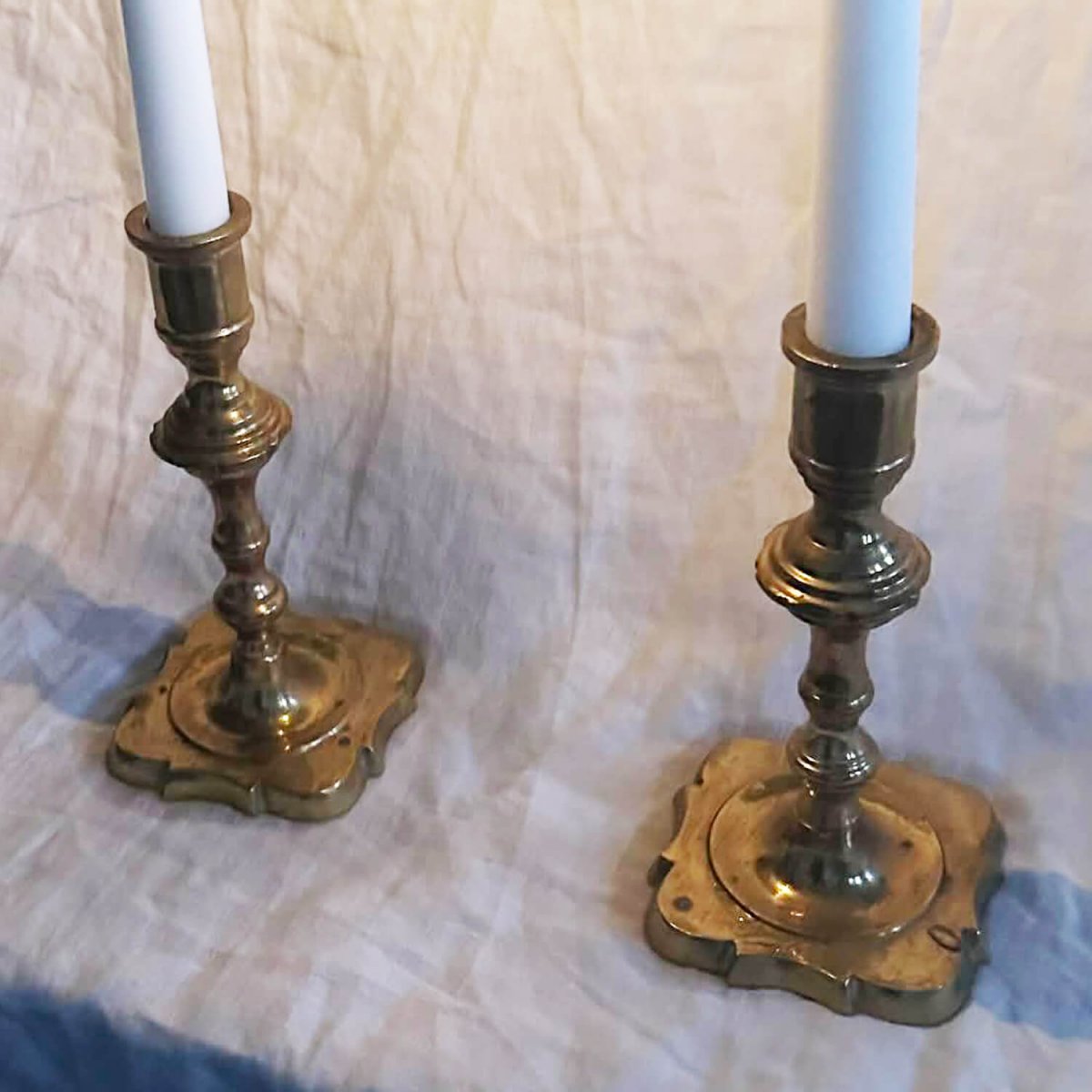 Vakkert par vintage lysestaker i messing med tidløs form og varm glans. Når lysene er tent reflekteres lyset vakkert i messingen og skaper en myk og innbydende stemning – perfekt for hyggelige kvelder og vakre borddekkinger.
