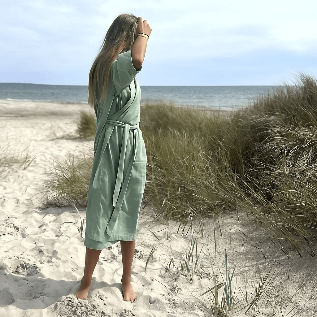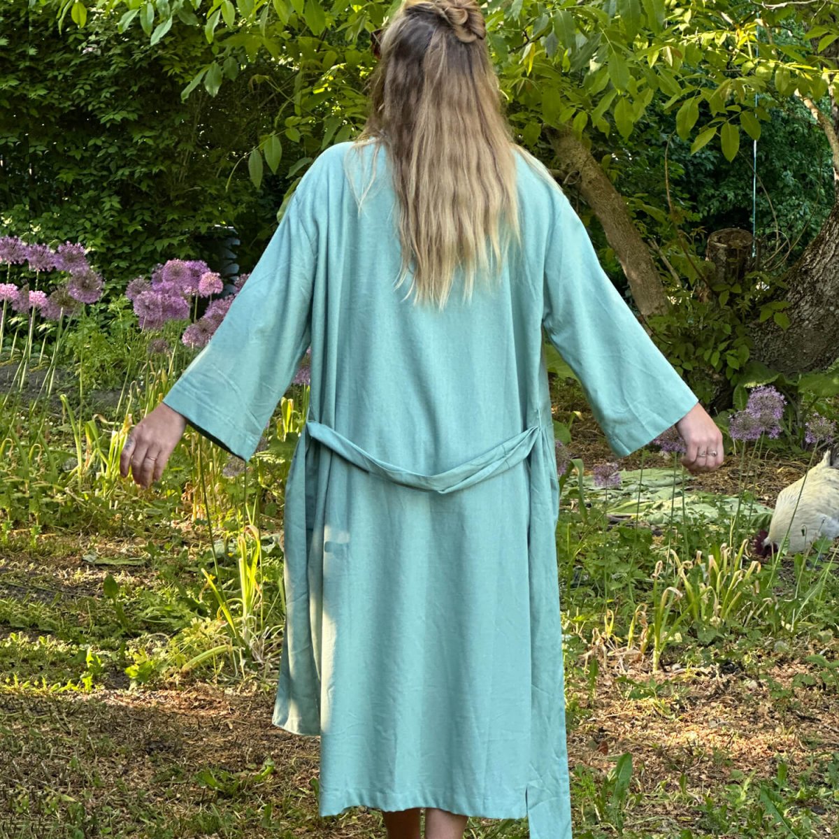 Kimono - lin fra Poppins Clothing. En nydelig morgenkåpe/kimono i 100% lin. Perfekt å ha som kimono på stranden, badekåpe til helgefrokosten eller bare som et koselig ytterplagg. Lommer på hver side og et langt matchende belte.